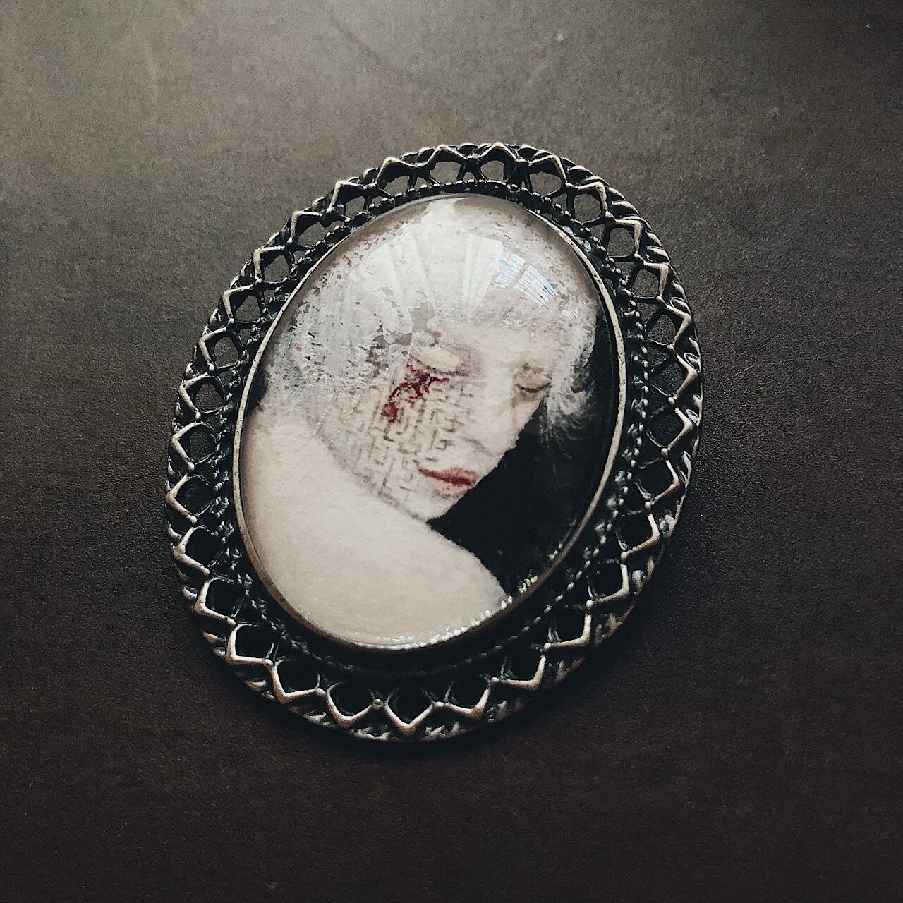 ちいさな原画と硝子を合わせたブローチになります。台座上部にカンが付いていますので、チェーンを通せばネックレスとしても使用できます。(ネックレスチェーンは付属していません)