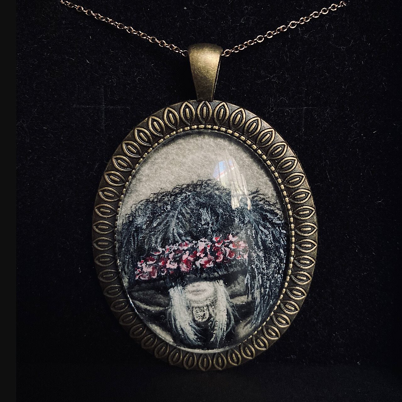 小さな原画と硝子を合わせたペンダントネックレスになります。