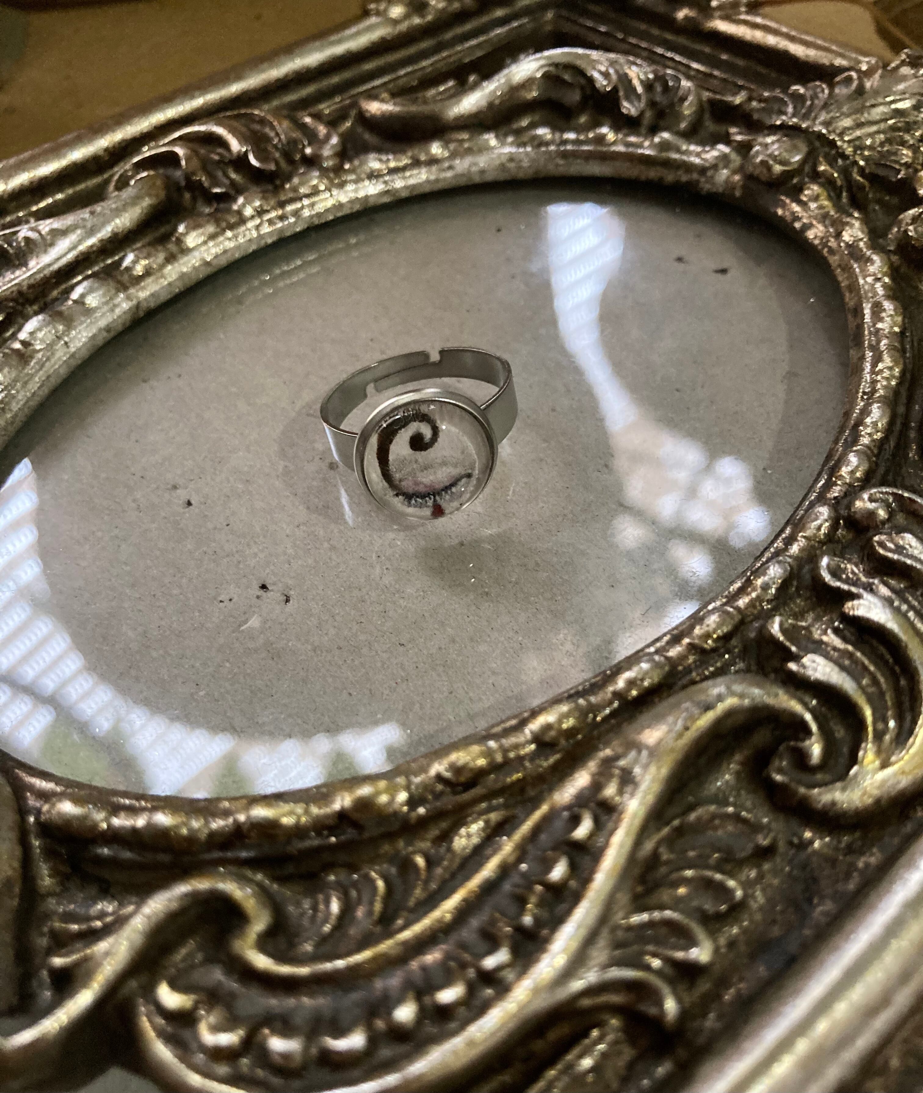 原画を硝子に閉じ込めた指輪になります。